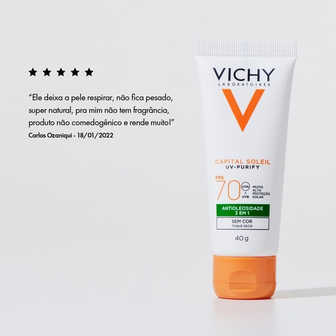 Protetor solar facial sem cor. Vichy Purify FPS 70 é ideal para conferir alta proteção contra os raios UVA e UVB, ao mesmo tempo que controla a oleosidade excessiva.